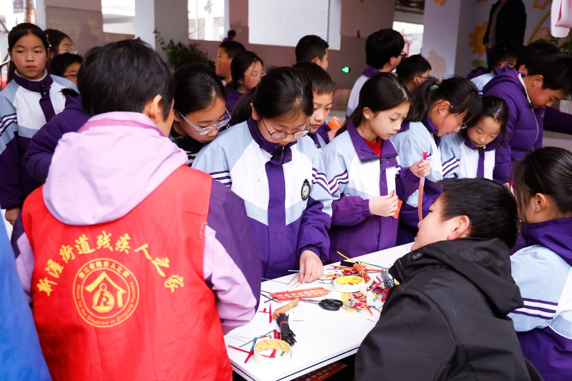 现场还有一群特殊的志愿者——磐安县新渥街道残疾人之家的老师们,他们虽身体不便却满怀热忱,手把手带着孩子们体验技艺。志愿者眼里闪动的光亮与孩子们脸上绽放的笑靥,交织成这个冬日里最温暖的画面。