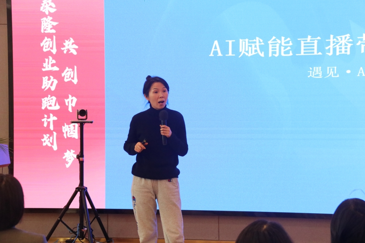 仪式结束后,淘宝教育认证讲师、阿里巴巴商学院创业导师冯慧为现场创业女性带来《AI赋能直播带货高效转化实战课》的专题培训。冯慧老师结合实际案例,深入浅出地解析了如何利用AI技术优化直播内容、运用数字人直播等实用技巧,全面提升直播带货的转化效率。培训内容实操性强,现场互动热烈。