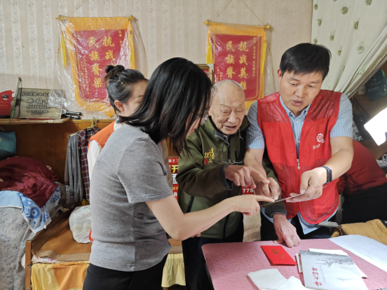 慰问团队带上第四季度关爱金和慰问物资,首先来到了吴绍德老兵的家中,详细询问了老人当前的生活状况和身体健康情况。吴绍德老人热情地为大家展示自己珍藏的老照片,讲述过往的经历。