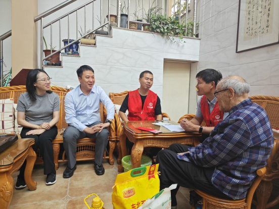 在老兵周祖其的家中,慰问团队与老人围坐在一起亲切交谈。周祖其老人今年已100岁高龄,虽听力不佳但精神矍铄,和来访人员互动频频。志愿者们向周祖其老人表达了崇高的敬意,并祝愿他健康长寿。